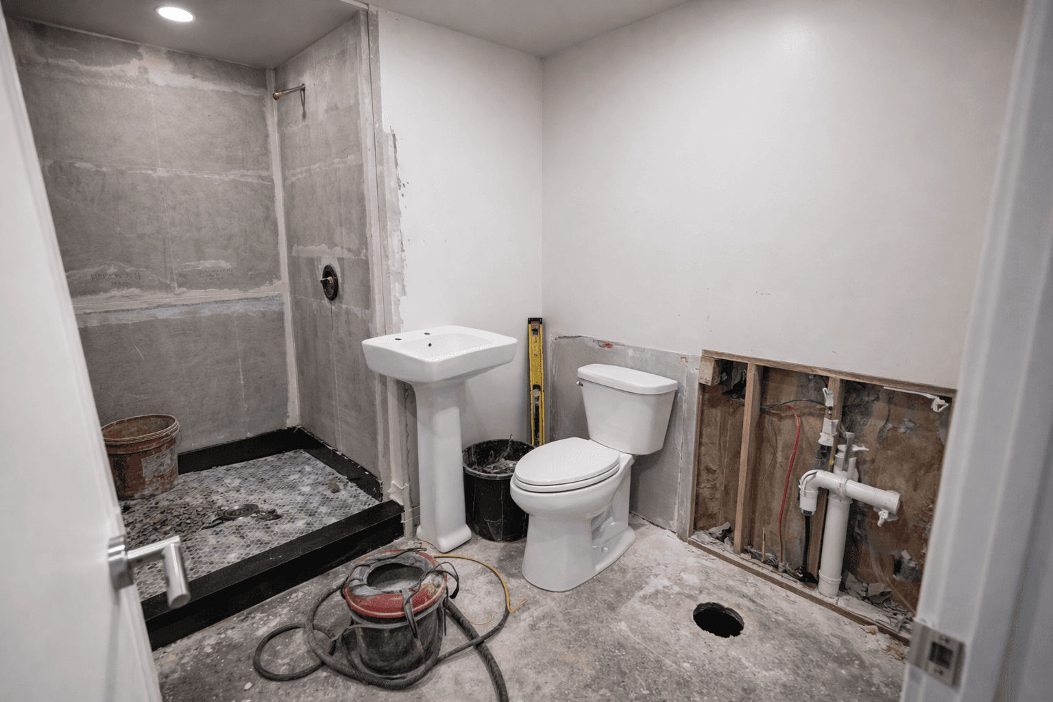 The finished design replaces that with a streamlined, contemporary aesthetic. A compact vanity with open lower storage improves functionality while keeping the room visually light, paired with a simple rectangular mirror and modern three-light fixture to evenly illuminate the space. Neutral gray walls, minimal trim contrast, and a cohesive palette create a calm, unified look that makes the room feel larger than its footprint.